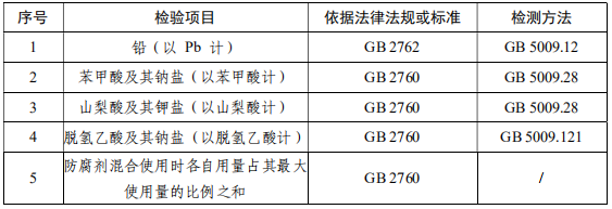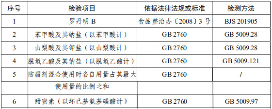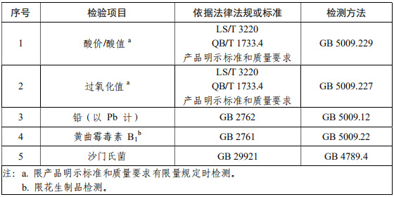 GB 2760 食品安全國家標準 食品添加劑使用標準 GB 2761 食品安全國家標準 食品中真菌毒素限量 GB 2762 食品安全國家標準 食品中污染物限量 GB 4789.4 食品安全國家標準 食品微生物學檢驗 沙門氏菌檢驗 GB 4789.10 食品安全國家標準 食品微生物學檢驗 金黃色葡萄球菌檢驗 GB 5009.12 食品安全國家標準 食品中鉛的測定 GB 5009.22 食品安全國家標準 食品中黃曲霉毒素 B 族和 G 族的測定 GB 5009.28 食品安全國家標準 食品中苯甲酸、山梨酸和糖精鈉的測定 GB 5009.97 食品安全國家標準 食品中環己基氨基磺酸鈉的測定 GB 5009.121 食品安全國家標準 食品中脫氫乙酸的測定 GB 5009.227 食品安全國家標準 食品中過氧化值的測定 GB 5009.229 食品安全國家標準 食品中酸價的測定 GB 29921 食品安全國家標準 食品中致病菌限量 BJS 201905 食品中羅丹明 B 的測定 LS/T 3220 芝麻醬 QB/T 1733.4 花生醬